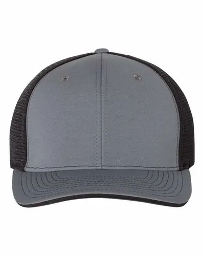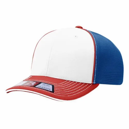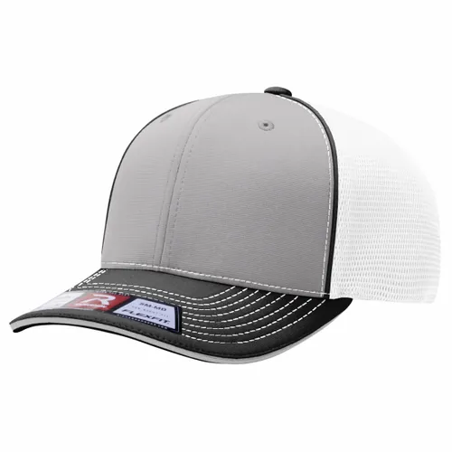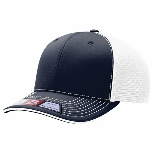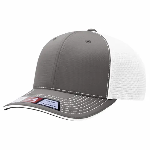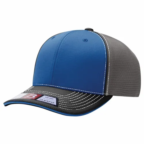 Front: 98% Polyester/2% Spandex  Back: 95% Polyester/5% Spandex Pulse Fabric, Sportmesh Structured, Six-panel, Mid Pro Profile Pre-curved Contrast Stitch Sandwich Bill Comfort Stretch Sweatband Small/Medium: 7 – 7 1/4″ Large/XLarge: 7 3/8″ – 7 5/8″