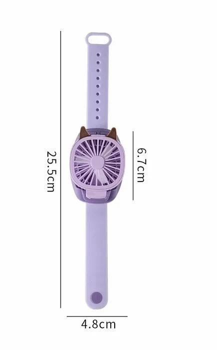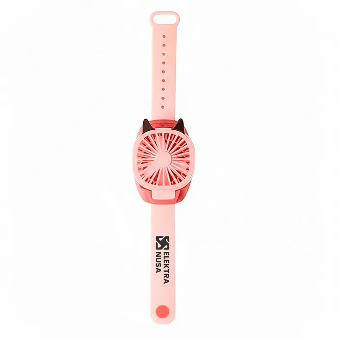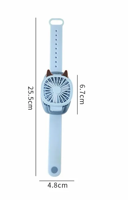 A custom wristband mini fan is a portable 10" × 2.6" fan made from ABS and PP plastic with a silicone wristband handle, designed for hands-free cooling and convenience. Featuring a 500mAh rechargeable battery and a 3-inch detachable handle, this fan combines practicality with fun.