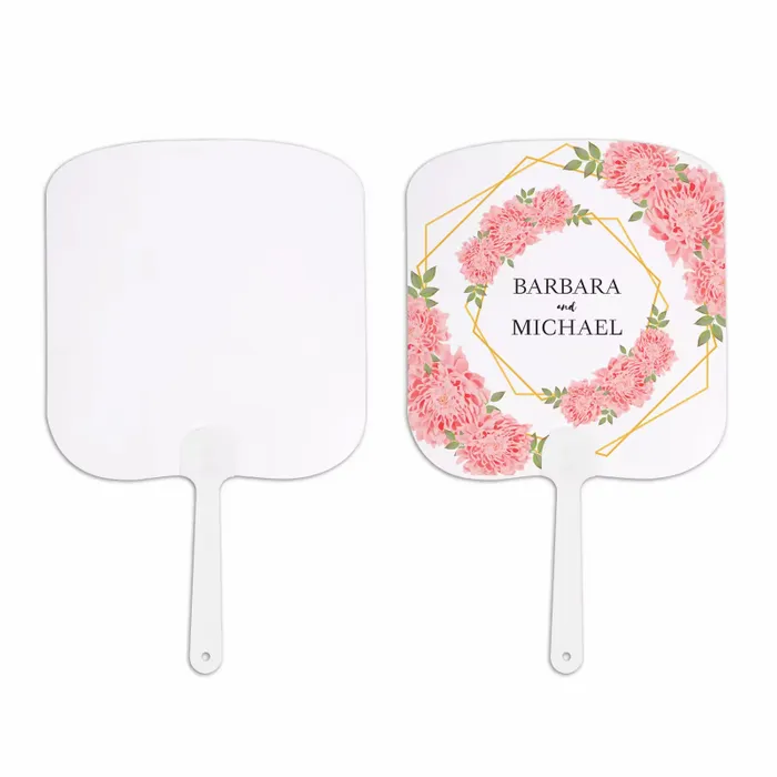 A custom plastic hand fan is a reusable fan made from smooth, durable plastic with a 5" stick handle for easy use. These fans are available in seven distinct shapes—round, square, diamond, heart, star, bread, and oval—and can be printed in full color, allowing your logo or design to stand out.