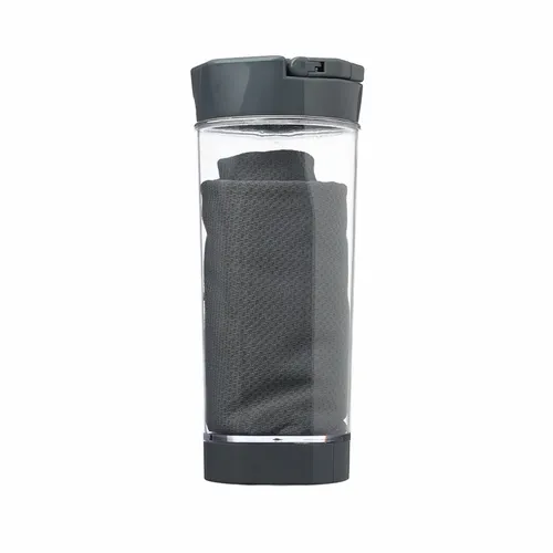 Sports Kit Cooling Towel with Bottle Holder. Clear Bottle Holders. Towel Color Matches the Lid Color of the Bottle. Phone Holder Available at the Bottom Part of the Bottle. Inserted Towel Measures 11.75” H x 31” L . Bottle Can Hold 11.83 oz or 350 ml of Liquid