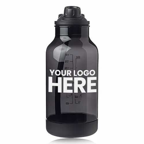 Plastic Water Bottle with Silicone Straw. Plastic Bottom Wrap. Carrying Handle with Flip Open Lid. 64 oz. Capacity Markings