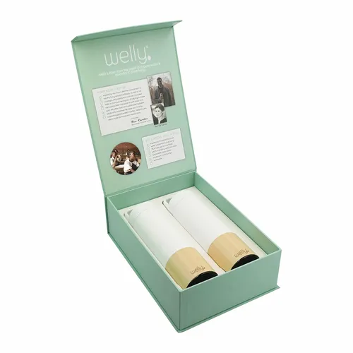 Includes 2 Welly Traveler Copper Vacuum Bottle 1629-01. The Welly Copper Vacuum Insulated Bottle features durable, double-wall stainless steel vacuum construction with copper insulation, which allows your beverage to stay cold for 48 hours and hot for at least 12 hours. The construction also prevents condensation on the outside of the bottle. Removable stainless steel infuser included. Comes complete with on-trend, durable powder coating and the natural bamboo wrap. It features a screw-on lid and a wide opening for comfortable filling and pouring. Perfect for ice cubes and fits most standard car cup holders. Due to the nature of bamboo and powder coated materials, there might be a slight difference on laser engraved logos. No two pieces are alike which makes each piece unique for you! Leeds Exclusive. 18oz. Gift Box is not decorated.