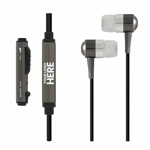 Metal hi-definition ear buds feature integrated volume control and microphone with premium sound quality and noise isolating design. Imprint your logo on the y-piece (center tube). Use with computers, mp3 players, smart phones and more.