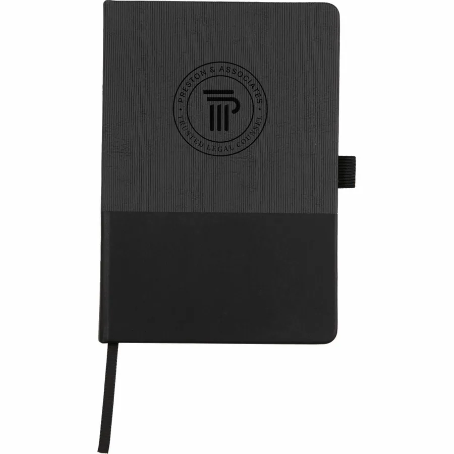 The 5.5 x 8.5 FSC Recycled Ribbed Bound Journal combines sustainable materials with a stylish design, featuring a hardbound cover made from 30% recycled post consumer polyester and polyurethane with a unique ribbed texture. This journal includes 80 sheets of FSC recycled, perforated paper, along with a color-matching ribbon page marker, elastic pen loop, and secure elastic closure. The inside back document pocket offers additional storage, while the JournalBooks logo embossed on the back adds a subtle touch of branding. Pen is not included. By choosing this notebook, you’re making a positive impact on the environment through a partnership with 1% For The Planet, as a portion of each sale supports environmental nonprofits.