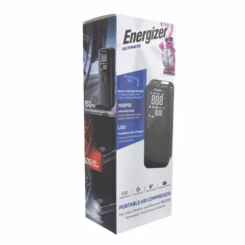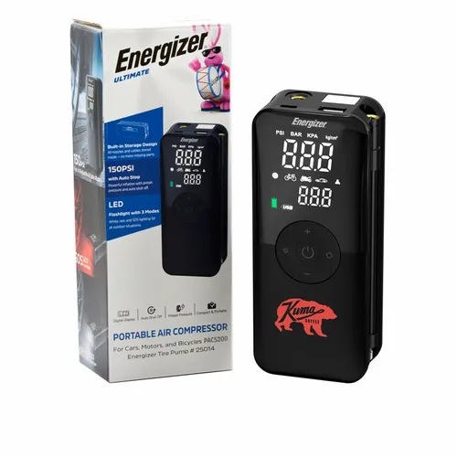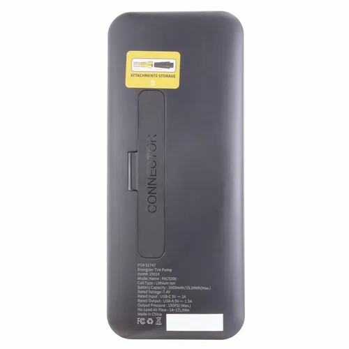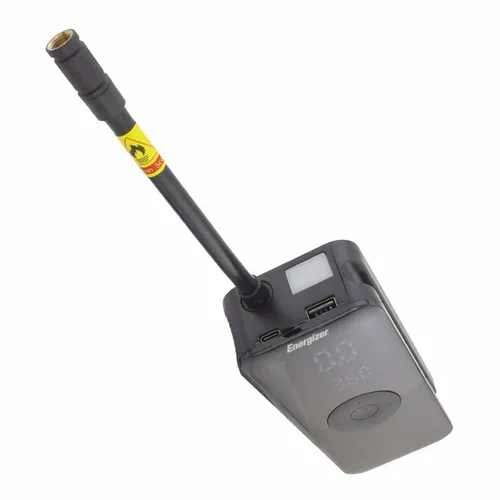 A portable and rechargeable electric tire pump with a large easy-to-view LCD display. It has five inflation modes: automotive, motorcycle, and bicycle tires as well as a setting for sports balls. It also functions as a power bank with a USB output port located on top. Recharge the air pump's built-in lithium battery via its Type-C input port. It is packaged with a compact attachable air hose and a Type-C cable. AC wall adapter not included.