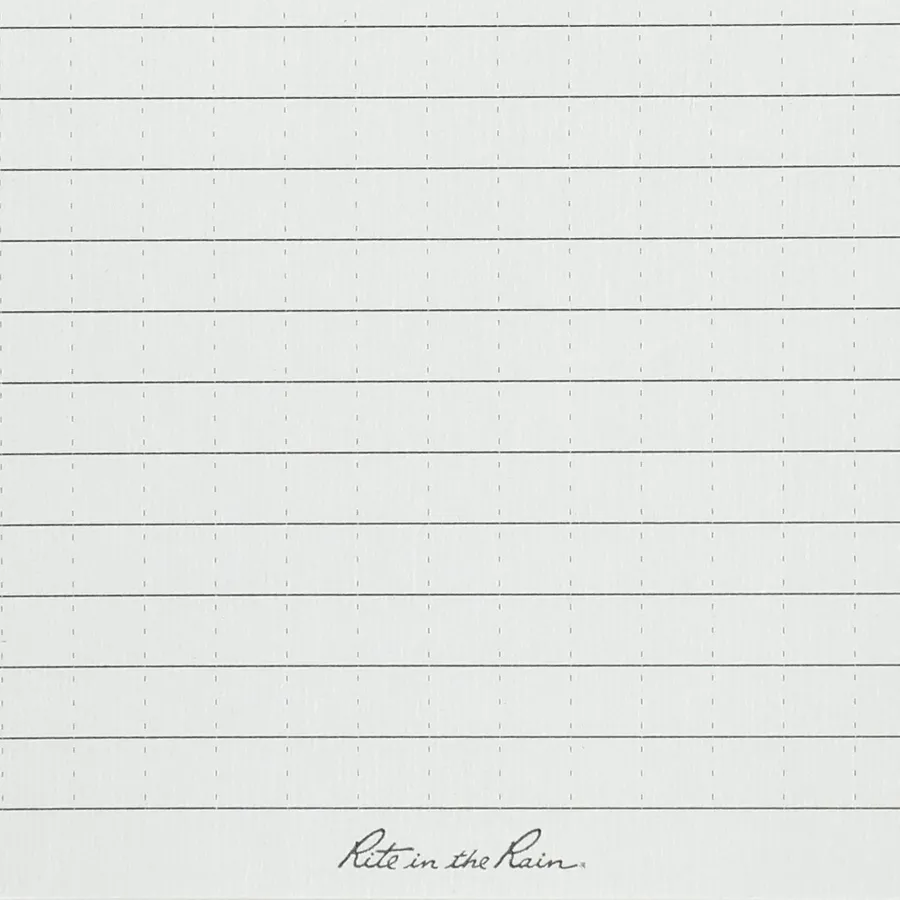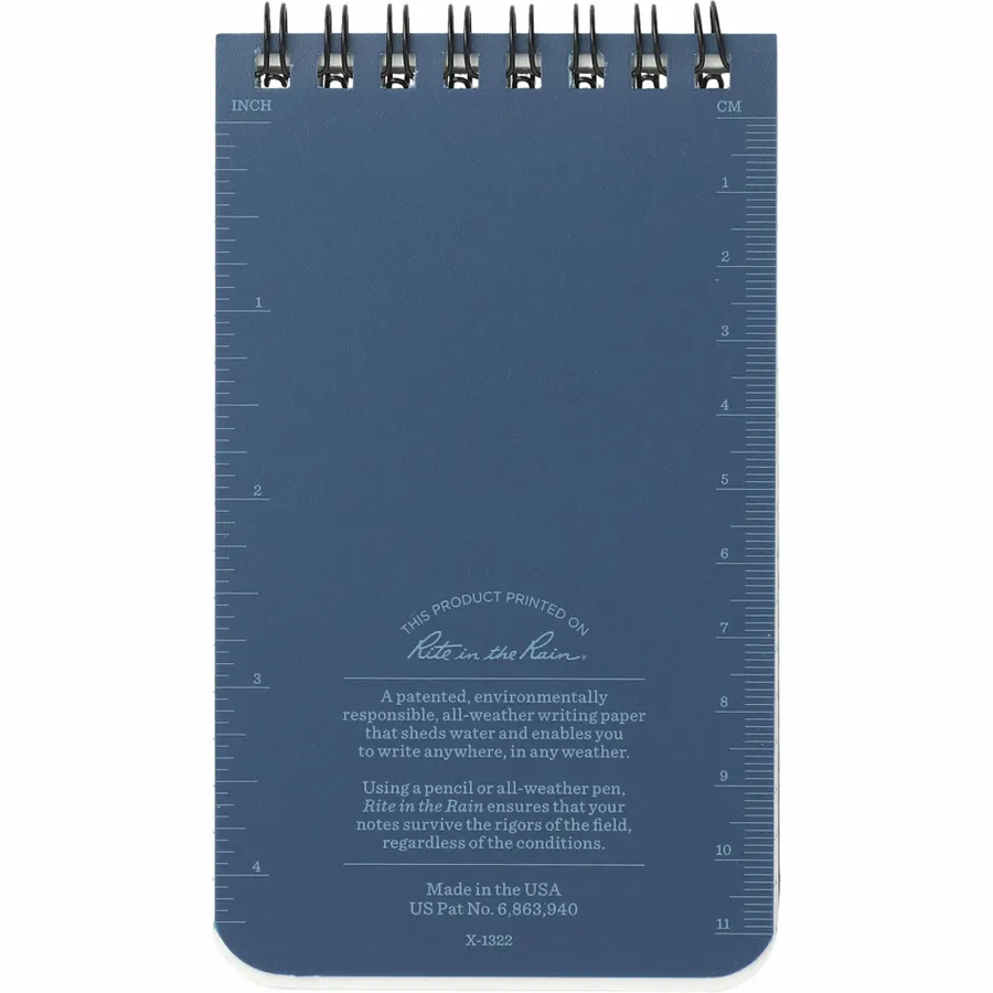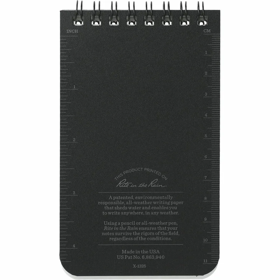 The 3” x 5” Rite in the Rain Top Spiral Notebook is tough enough to survive rain, sweat, mud and anything else mother nature throws at it. This notebook features a hard polydura cover to protect your notes from scratches and stains and impact-resistant Wire-O binding that will keep its shape. Includes 50 sheets of white lined paper.