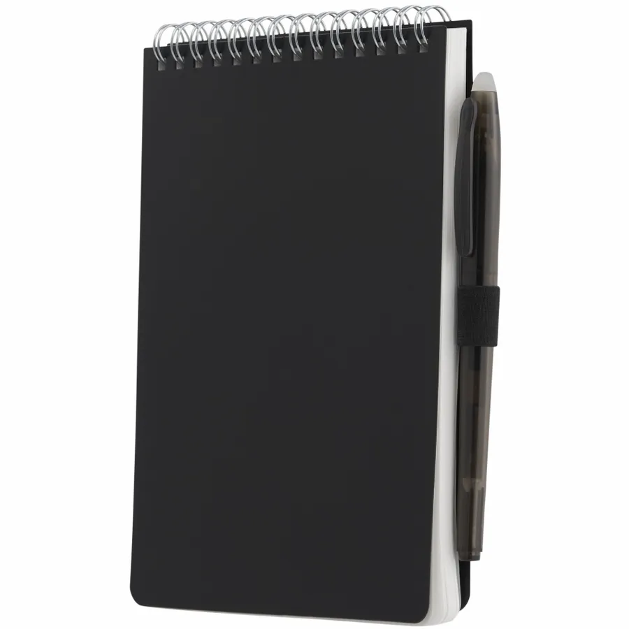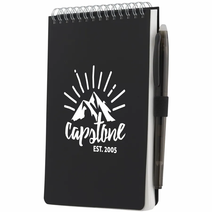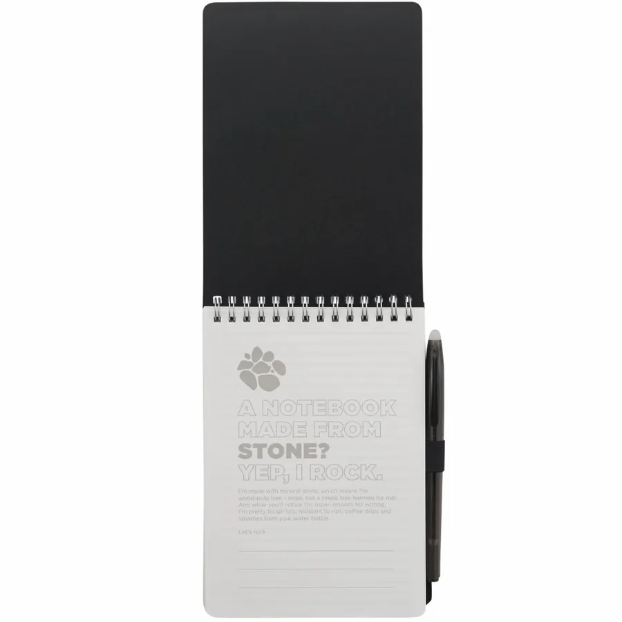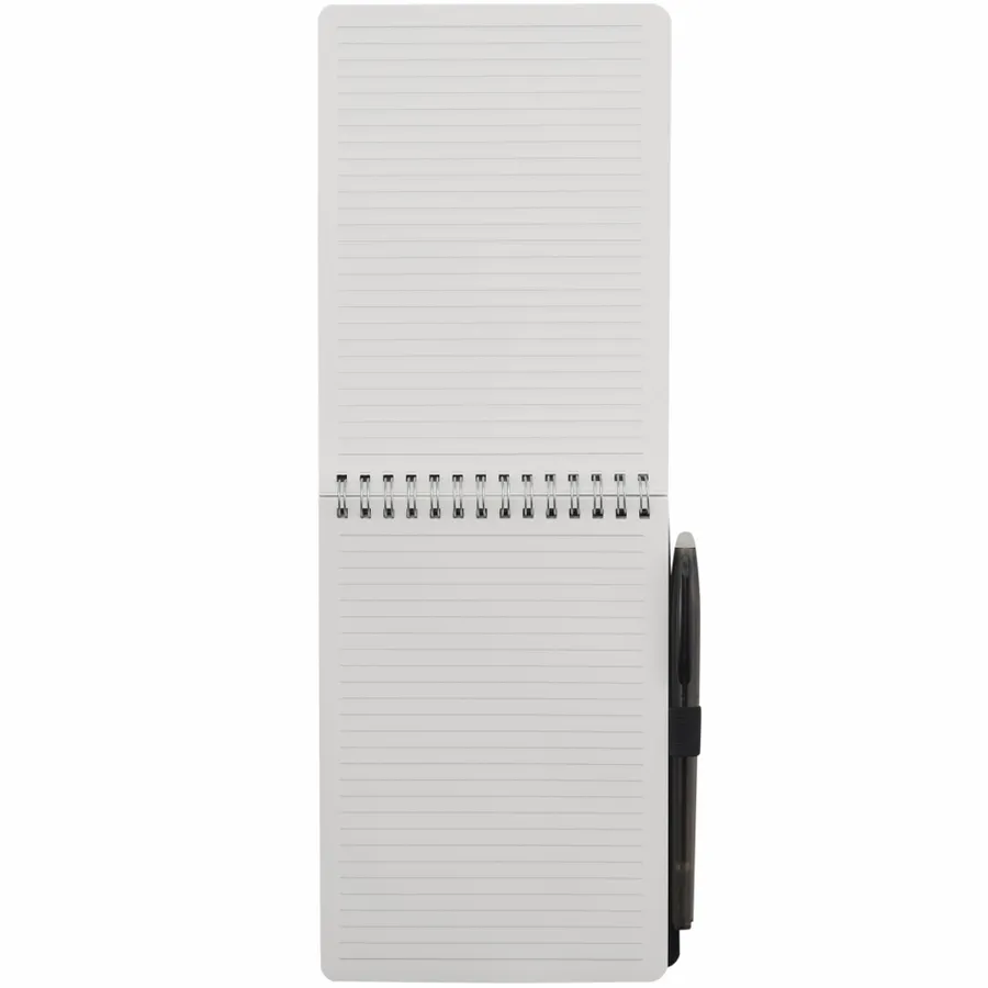 The 5” x 7” Mineral Stone Field Reporter Notebook with Pen features a recycled PP cover, 64 sheets of lined stone paper and silver wire binding. Includes a RPET erasable pen with black ink and elastic pen loop. Through a partnership with 1% For The Planet, one percent of sales of all EcoSmart products are donated to environmental nonprofits. Note that pens are packed separately.