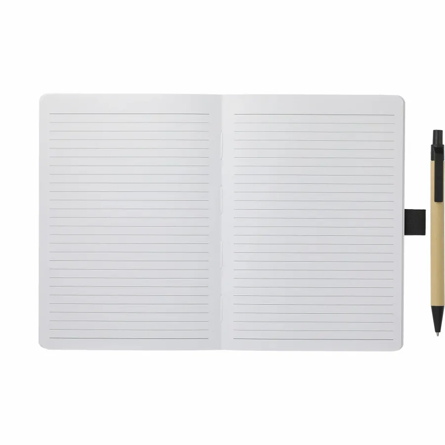 The 5 x 7 FSC Recycled Notebook and Pen Set features a FSC recycled hard cover with exposed stitched spine, black elastic closure and pen loop. Includes 80 sheets of FSC recycled white lined paper and matching FSC recycled paper barrel pen with black ink cartridge. Through a partnership with 1% For The Planet, one percent of sales of all EcoSmart products are donated to environmental nonprofits. Note that pens are packed separately.