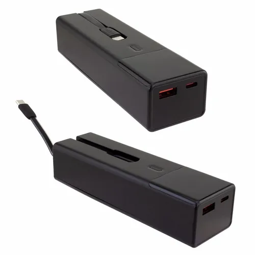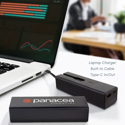 A laptop and smart phone power bank with a built-in cable for input/output. A perfect blend of function and size. It's the smallest power bank with 100W output to charge all laptops with a type-C power port. Specifications: Battery: LI-ION Battery USB-A Output: 5V /2.1 A;9V /2.0A; 12V / 1 .SA; 1 0V /2.25A TYPE-C Output & Input: 5V /3.0A;9V /3.0A; 12V /3.0A; 15V /3.0A;20V /5.0A Built-in TYPE-C Cable Output & Input: 5V /3.0A;9V /3.0A; 12V /3.0A; 15V /3A;20V /5.0A Capacity: 10
