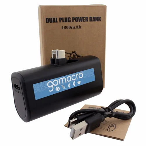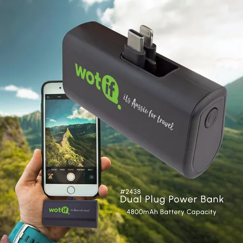 A dual charging power bank with built-in Lightning and Type-C plugs that can be flipped down when not in use. It is easy to attach to a phone and use throughout a workday while on business trips or during vacation travel.