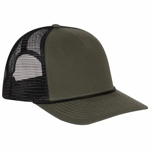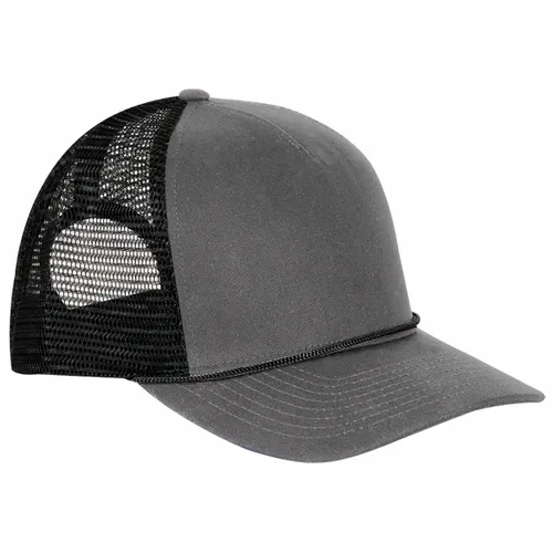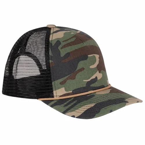 Front: 100% Cotton Twill Back: 100% Polyester Classic Trucker Mesh Professional Fit: Structured, Pro Shape Profile with Rope, Slightly Curved Bill, Black Undervisor Five-panel NO Sweat Moisture-wicking Sweatband Snapback Closure