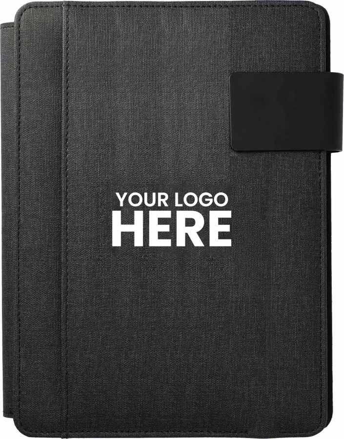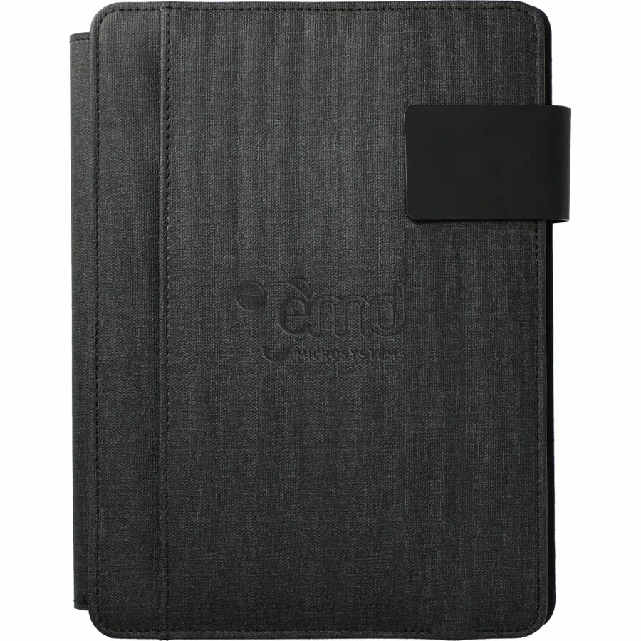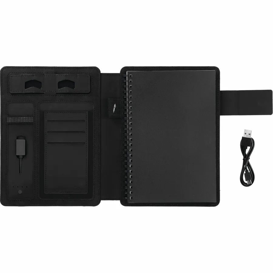 The FSC Mix Titus 5000 mAh Wireless Charging Journal combines the timeless practicality of a notebook with the modern convenience of a powerbank - all in one durable UltraHyde package. This refillable journal has a built-in 5000 mAh powerbank that supports both cable and wireless charging up to 1A. Charge the powerbank wirelessly or use the included USB port with any compatible device. Additional features of the FSC Mix Titus Wireless Charging Journal include a built-in phone stand, an elastic pen loop, and a zip-closure folio with a dedicated smartphone pocket. It also comes with a bound 8.5 H x 5.5 W notebook that contains 64 lined sheets of FSC Mix cream-colored paper.