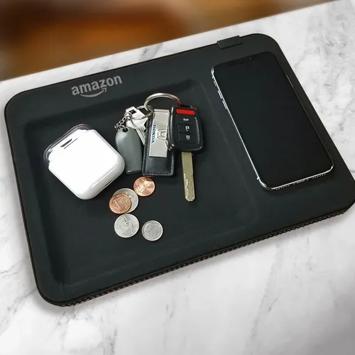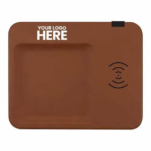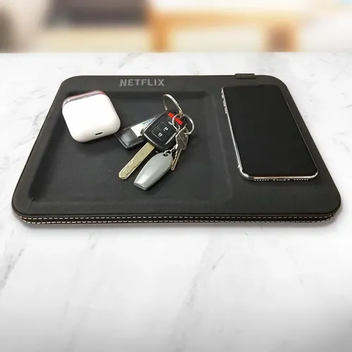This leatherette decor piece features both a key caddy and an integrated wireless charging mat. An excellent piece for office or home use. Decorate with full color printing or laser engraving. Laser engrave on black to show your logo in silver Laser engrave on brown to show your logo in black Wireless Output: 5V 1A, 5W (purchased before 4/20/2022) | 5V 2A, 10W (purchased after 4/20/2022)