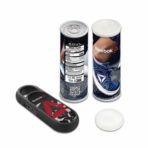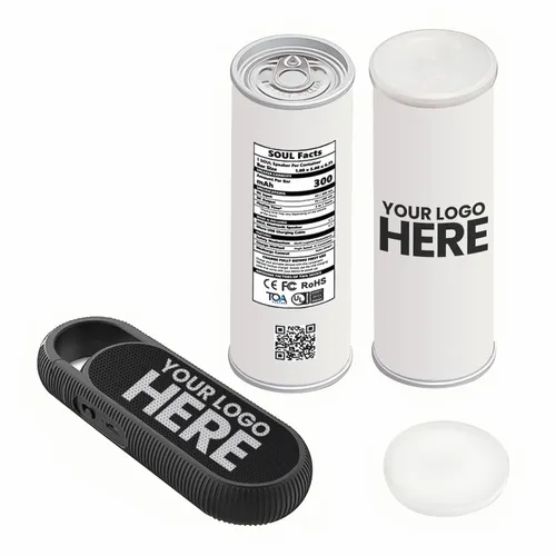 The Soul Speaker is a portable Bluetooth speaker with a lever clip to easily attach to a backpack, handbag, or carrying case while traveling. Plus, it comes packaged in a fun and unique custom-branded pull-tab pop-can. It's a memorable and playful way to give a gift that will bring the joy of music while on 'Soul'ful journeys. It is available for full-color printing on the speaker grill and pop-can packaging.